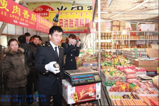 ??? 此次行動重點對新城區車站華聯超市、玉泉區開泰農貿市場、賽罕區金橋開發區加油站進行了檢查。檢查中發現部分食品定量包裝存在短斤少兩的現象,集貿市場不少經銷商都在桿秤上做了手腳,欺詐消費者,獲取不當得利,特別是開泰農貿市場商戶的桿秤未經計量院檢定。